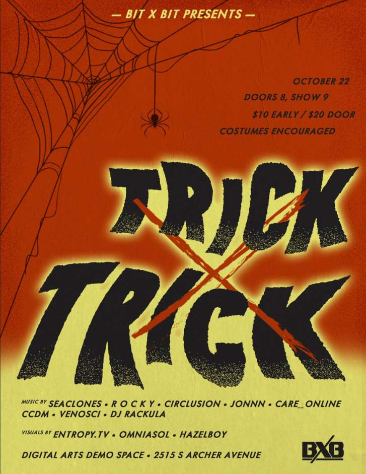 BIT X BIT PRESENTS: TRICK BY TRICK, A SPOOKY DANCE MUSIC EXPERIENCE. FEATURING SeaClones | R O C K Y | Circlusion | Jonnn | Care_Online | CCDM | Venosci | DJ Rackula WITH VISUALS BY Entropy.tv / Omniasol/ Hazelboy PLUS: INTERACTIVE ART AND SPOOKY SURPRISES BOO-OUT THE NIGHT. COME DANCE THE NIGHT AWAY TO OUR ALL STAR SPINE-UP OF DREAD-LINING PERFORMERS